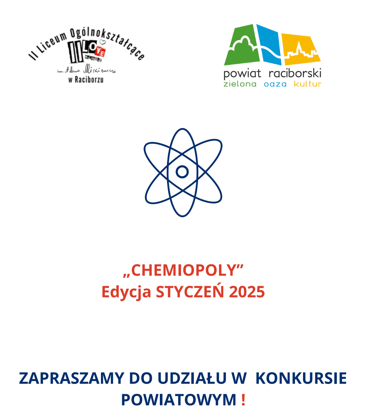 Drodzy Uczniowie! Serdecznie zapraszamy do udziału w I Powiatowym Konkursie Chemicznym "Chemiopoly", edycja styczeń 2025. Prosimy o zapoznanie się z regulaminem konkursu i przesłanie wypełnionych...