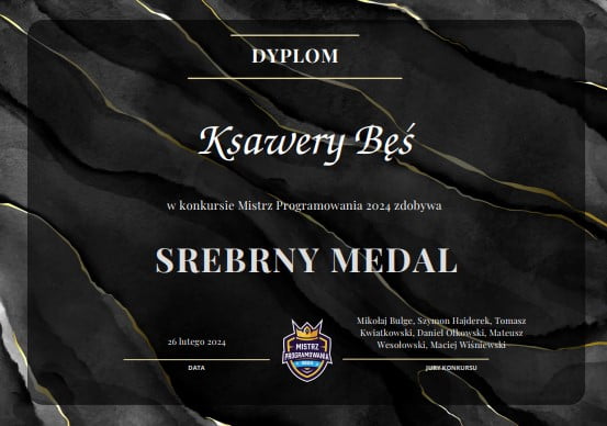 Ksawery Bęś, uczeń klasy 2m, zdobył wyróżnienie w finale XXI Śląskiego Konkursu Matematycznego oraz srebrny medal w ogólnopolskim konkursie Mistrz Programowania 2024. Śląski Konkurs matematyczny...