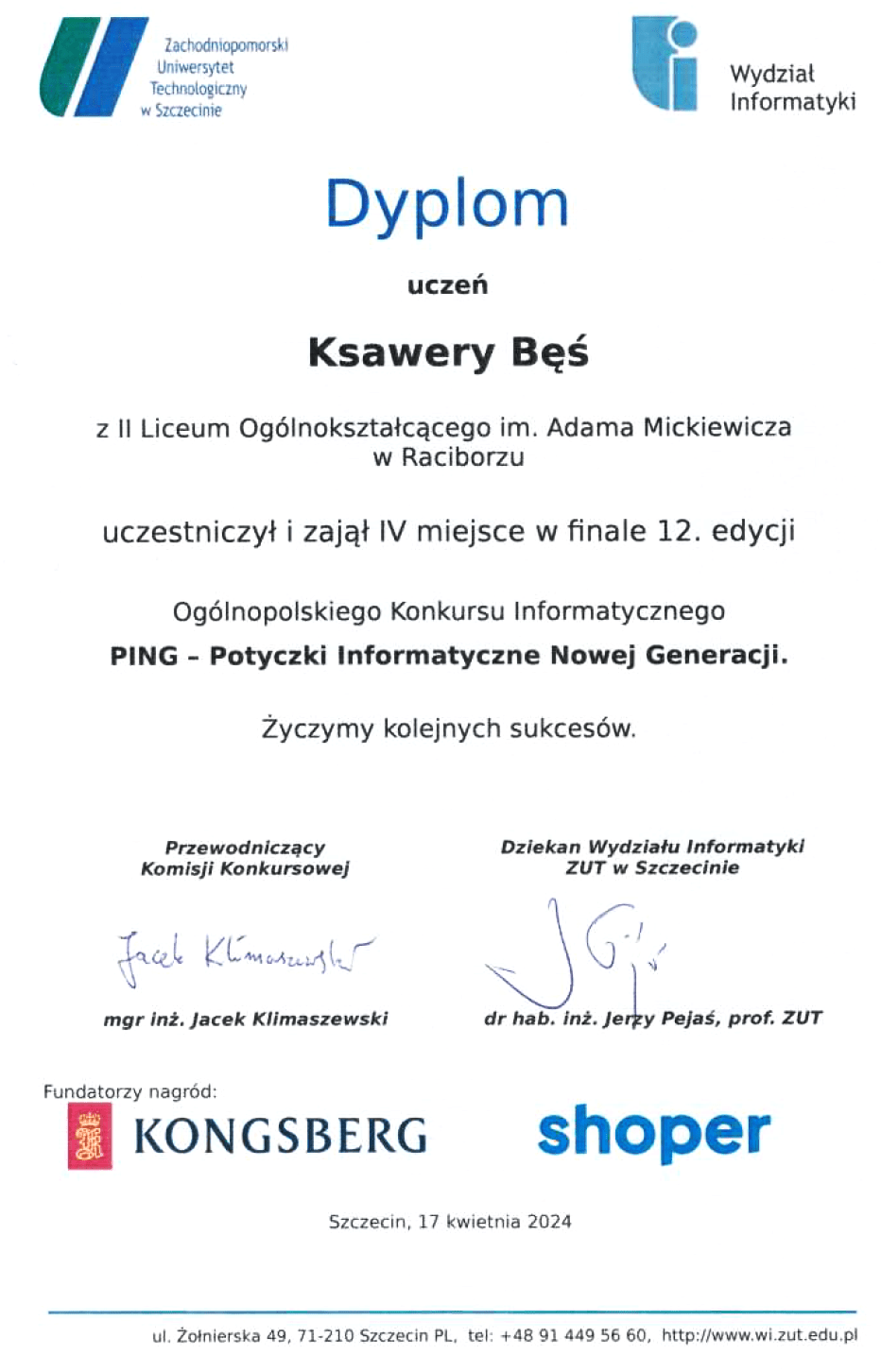 Z radością informujemy o kolejnym sukcesie ucznia klasy 2m. Ksawery Bęś zajął IV miejsce w 12. edycji Ogólnopolskiego Konkursu Informatycznego PING - Potyczki Informatyczne Nowej Generacji....