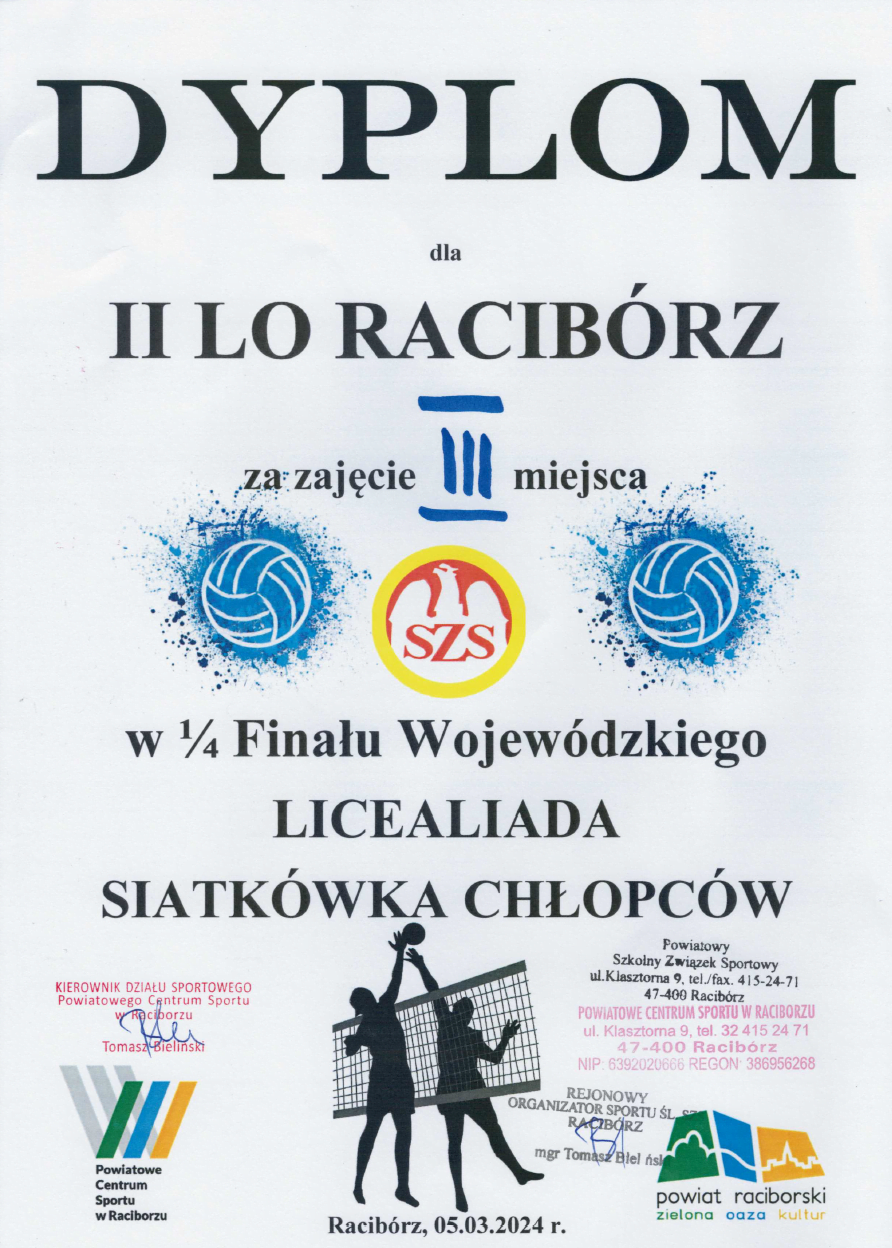 5 marca w Arenie Rafako, rozegrano Ćwierćfinały Wojewódzkie Szkół Ponadpodstawowych w Piłce Siatkowej Mężczyzn, w których nasi siatkarze zajęli III miejsce. Naszą szkołę reprezentowali: Bartosz...
